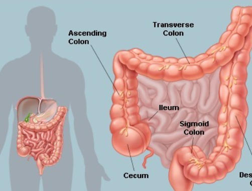 The colon is also called the large intestine. The ileum (last part of the small intestine) connects to the cecum (first part of the colon) in the lower right abdomen. The rest of the colon is divided into four parts:•The ascending colon travels up the right side of the abdomen.•The transverse colon runs across the abdomen.•The descending colon travels down the left abdomen.•The sigmoid colon is a short curving of the colon, just before the rectum.Thecolonremoveswater,salt,andsomenutrientsformingstool. Muscleslinethecolon'swalls,squeezingitscontentsalong. Billionsofbacteriacoatthecolonanditscontents,livingina healthy balance with the body.